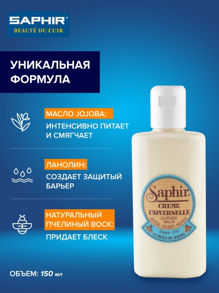Идеально подходит для всех видов гладких кож (одежда, обувь, мебель, кожгалантерея). Состав на основе ланолина, натурального пчелиного воска и масла Jojoba одновременно мягко очищает, интенсивно питает, и придает коже водоотталкивающие свойства.