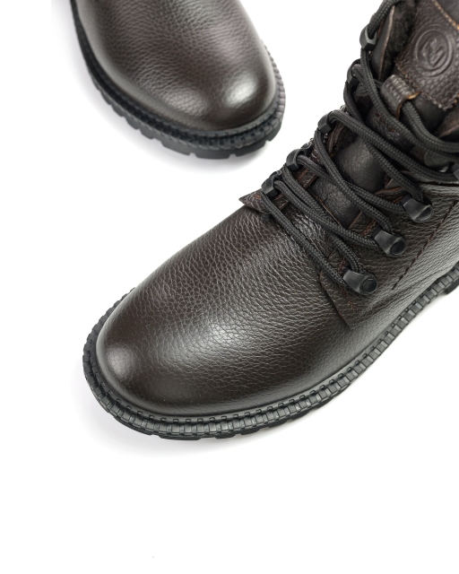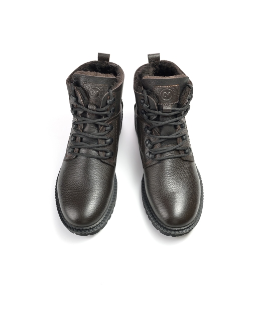 Ботинки изготовлены из мягкой зернистой натуральной кожи, в процессе производства которая проходит обработку восками для большей влагостойкости, отличается хорошей устойчивостью к грязи и прочим внешним воздействиям. Кроме того, лучше подходит для осени и зимы. Подошва из материала ТЭП  защитит от холода в осенне-зимний сезон.Ботинки имеют боковую молнию и шнуровку, удобны для надевания и  снятия. По высоте, ботинки прикрывают щиколотку, голенище ботинка изготовлено из меховой овчины для комфортного прилегания к коже и удержания тепла.В нижней части ботинка утеплитель-шерсть.
