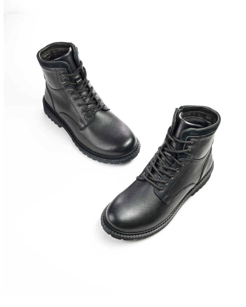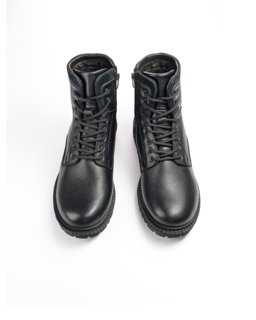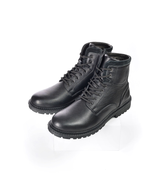 Ботинки изготовлены из мягкой зернистой натуральной кожи, в процессе производства которая проходит обработку восками для большей влагостойкости, отличается хорошей устойчивостью к грязи и прочим внешним воздействиям. Кроме того, лучше подходит для осени и зимы. Подошва из материала ТЭП, которая защитит от холода в осенне-зимний сезон. По высоте, ботинки прикрывают щиколотку, имеют боковую молнию и шнуровку, удобны для надевания и снятия.