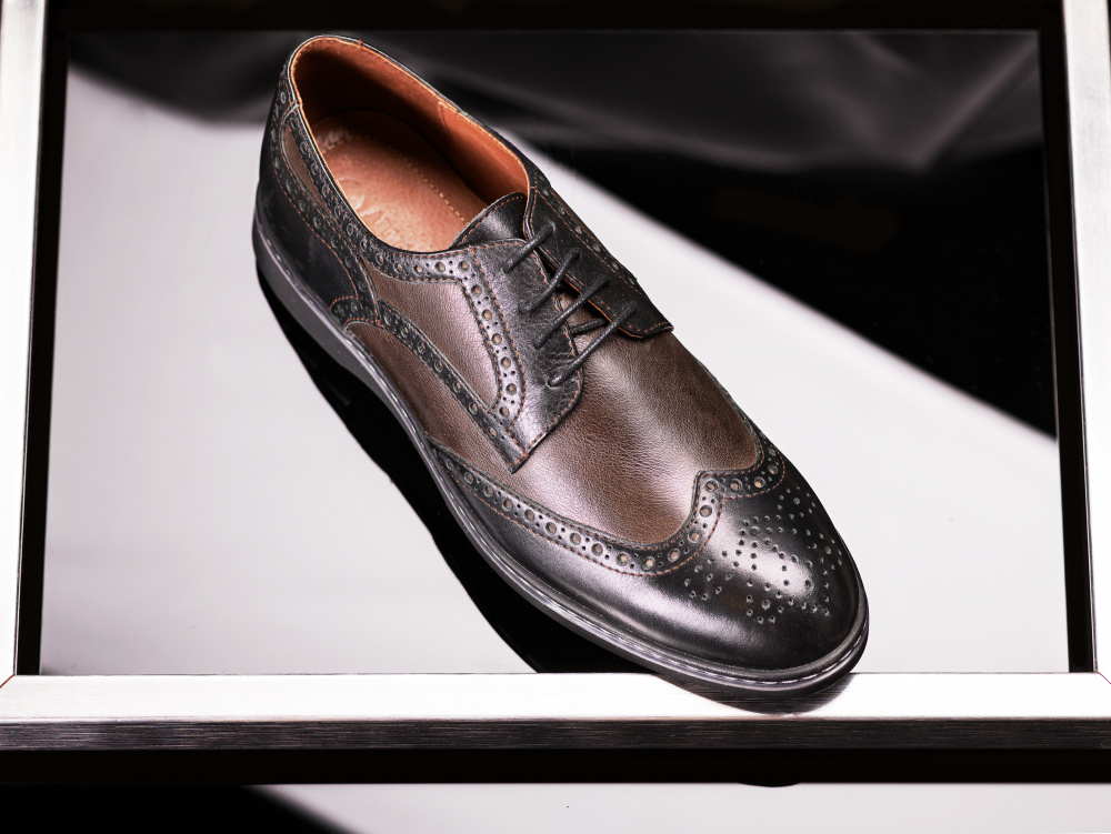 Туфли выполнены в стиле оксфордов из натуральной кожи с затемненным градиентом по швам и носочной части.