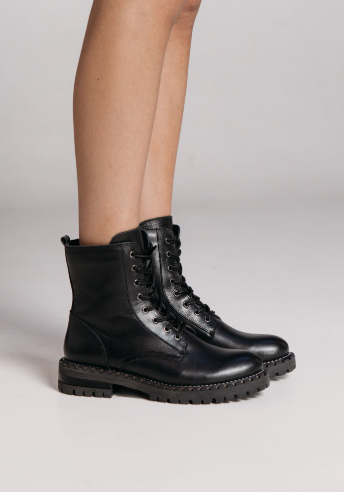 Ботинки Ariane в классическом стиле-гармоничное сочетание комфорта и моды. В этой модели сделана ставка на стильный дизайн подошвы. Модель выполнена из натуральной гладкой кожи черного цвета. Оригинальный двойной шнурок на голенище помогает  плотно фиксировать ботинки на ноге, а молния с внутренней стороны позволяют легко снимать и надевать ботинки. Дополнительный комфорт создают  стельки изготовленные, как и подклад ботинок из утепленной байки для осеннего варианта либо шерсти или натурального меха для зимнего варианта. Ботинки в классическом стиле можно носить  с куртками-бомберами, пальто, пуховиками, укороченными джинсами, юбками различной длины и плотными колготками.