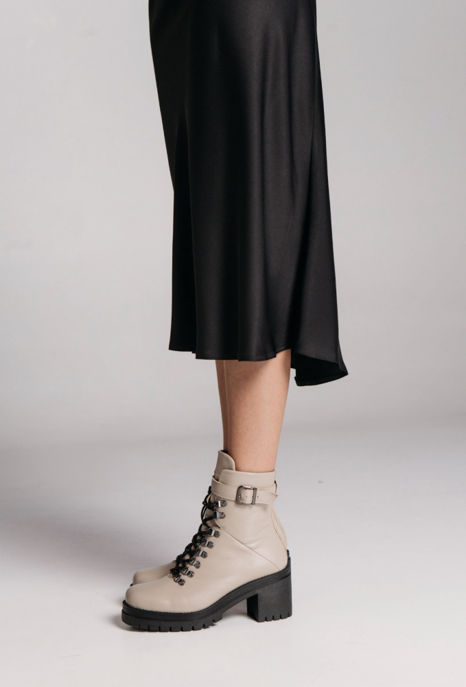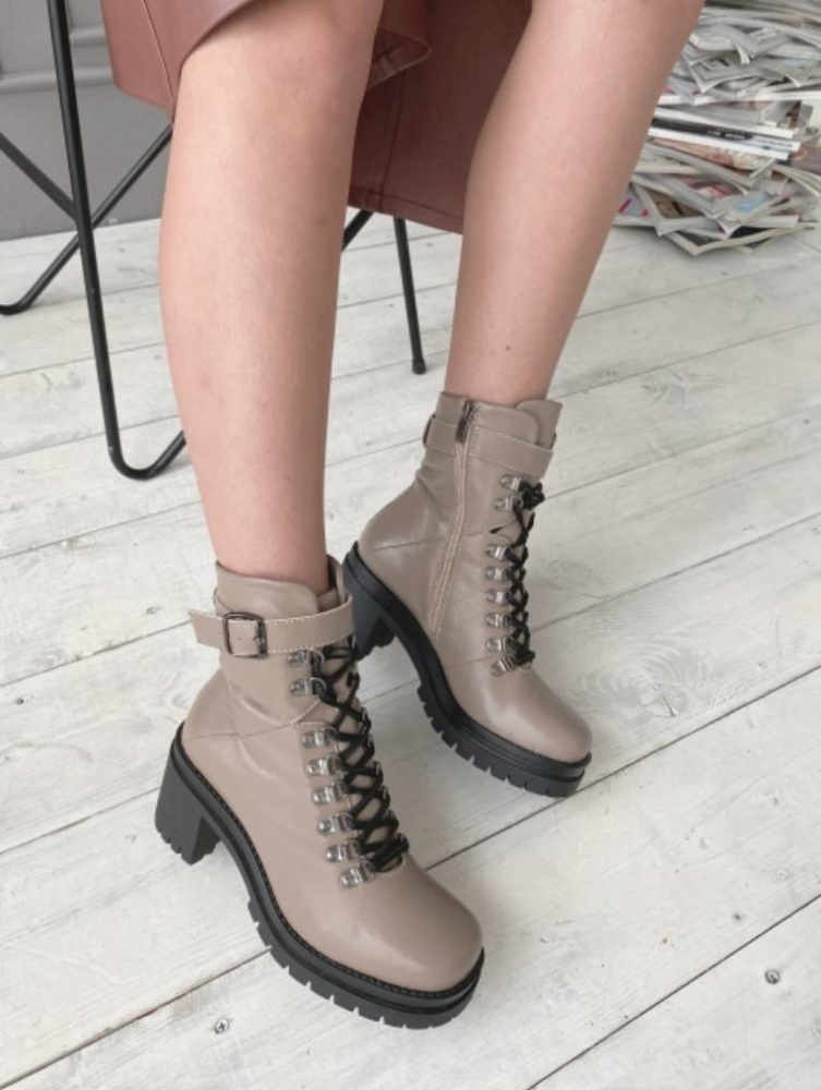 Ботинки Rosabella  не только удобны, но и элегантны. Шнуровка с декоративными металлическими петлями акцентирует внимание подчеркивая изящный подъем стопы.  Для создания этой модели использовали натуральную кожу в самых ходовых цветах: черного, белого, бордового и цвета лате. Модель предусматривает мягкую утепленную текстильную подкладку на осень, шерстяную или меховую подкладку и  стельку для зимы. Утолщенная подошва с устойчивым широким каблуком и протектором обеспечит уверенную походку за счет стойкого сцепления с поверхностью, а также защитит ноги от холода и слякоти.  В таких ботинках можно смело отправиться на долгую прогулку по городу несмотря на каблук.