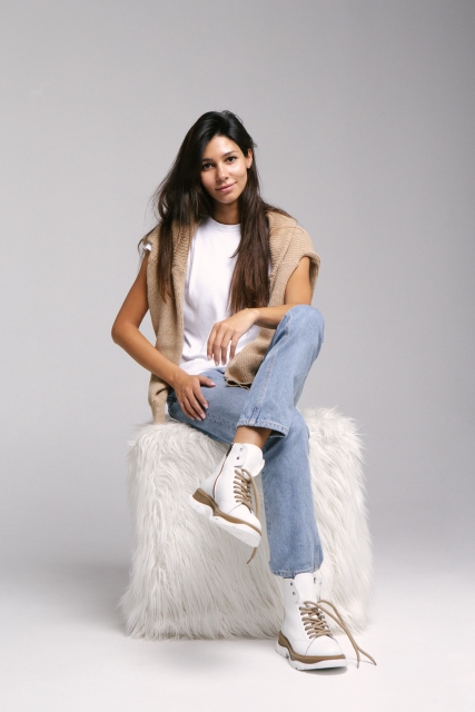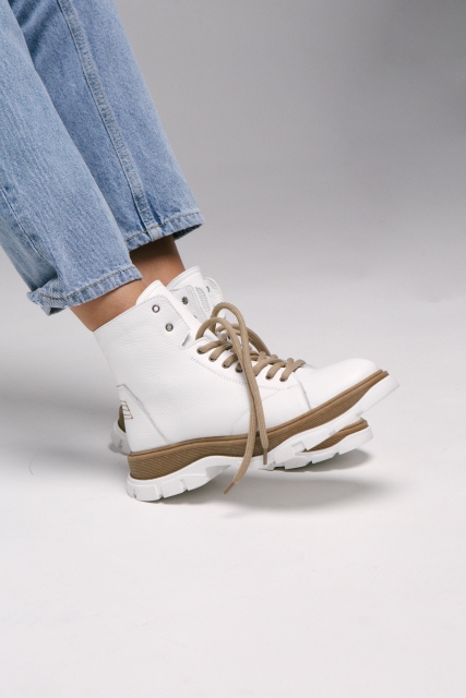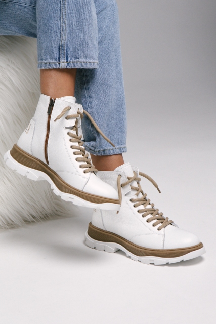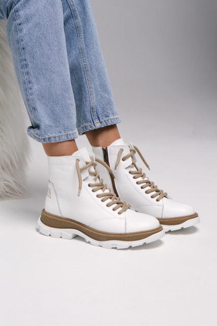 Ботинки Monica  с акцентом на сочетание цветов и фактур деталей выполнены из мягкой натуральной кожи. Утолщенная рельефная подошва в спортивном стиле из облегченного материала термоэластопласта, который  практически не скользит по мокрым и заснеженным дорогам и подходит для зимних температур,  сочетается с основными цветами модели. Ботинки шнуруются в тон модели, с внутренней сторны имеется молния, что облегчает процесс надевания и снятия, поскольку не нужно расшнуровывать, а также делает модель подходящей  для любой полноты щиколотки и голени. Модель изготавливается  на различных подкладках- байка, шерсть или мех.  Модные ботинки поддержат современный городской образ с пуховиками, пальто или бомберами, согреют Вас в холодную погоду. Модель не маломерит, подходит для широкой стопы.