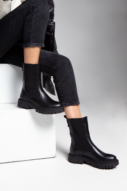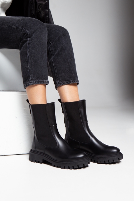 Высокие Челси, в черном цвете из натуральной кожи на подошве с протектором, которая защитит от холода и грязи, будут стильным дополнением модного образа. Резинки с двух сторон обеспечивают оптимальную посадку по ноге и удобство для надевания и снятия.Челси из натуральной кожи до середины икры  с  мягкой подкладкой из байки или шерсти, комфортной стелькой, отлично впишутся в осенние и зимние образы.