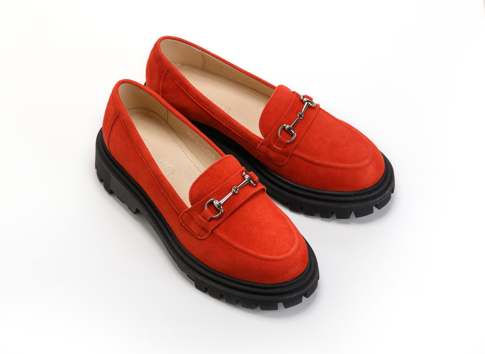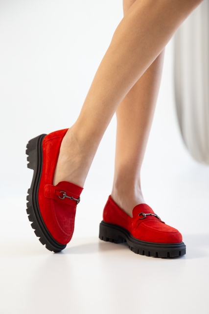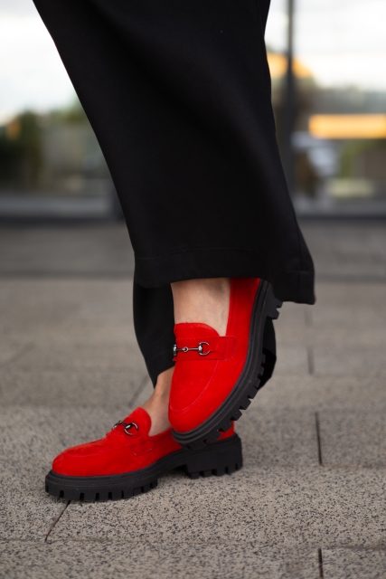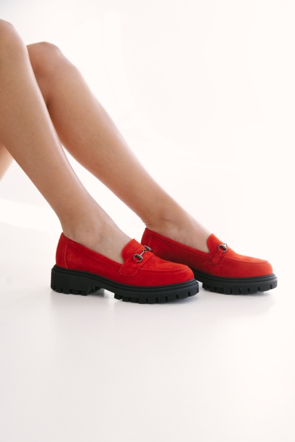 Лоферы с декоративной металлической фурнитурой из натуральной замши в ярко-красном цвете  будут притягивать взгляды. Модель  станет украшением деловых и повседневных модных образов. В процессе производства модели использовалась натуральная замша и подкладка из натуральной кожи. Подошва из антискользящего технологичного материала обеспечит комфорт и необходимую амортизацию при долгих прогулках.