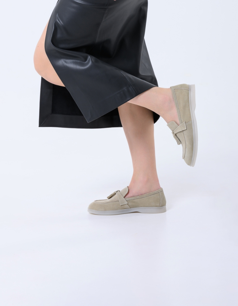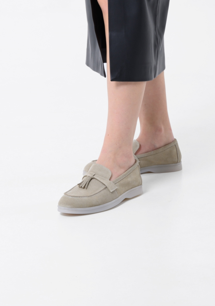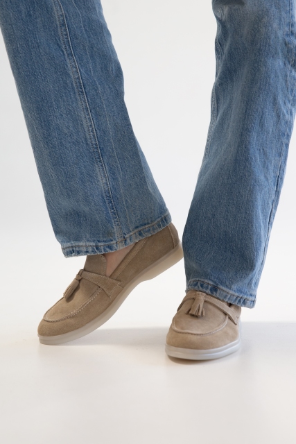 Лоферы из мягкой натуральной замши песочного цвета с комфортной  колодкой  на гибкой  подошве  с антискользящим эффектом обеспечат комфорт ногам в течении всего дня. Такую обувь можно носить с большинством  моделей одежды, с  платьем, классическими джинсами или другим casual-наряд.