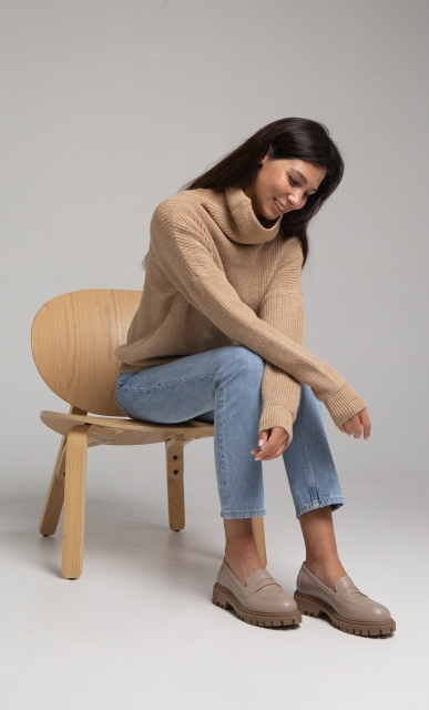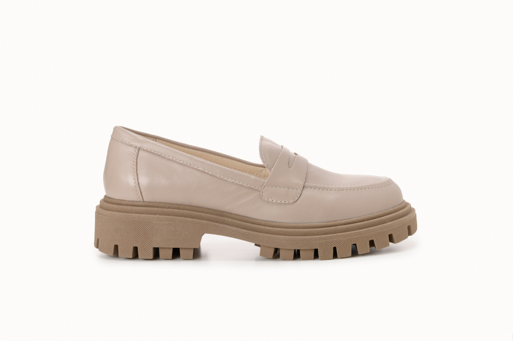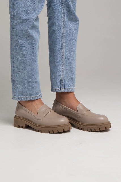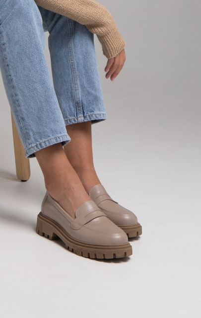 Демисезонные лоферы в нежном цвете латте изготовлены из натуральной кожи с мягкой подкладкой и стелькой, также изготовленной из натуральной кожи. Удобная колодка, рельефная подошва  создадут комфорт для длительных походов. Под такую обувь подойдут романтичное платье,  джинсы, костюмные брюки.