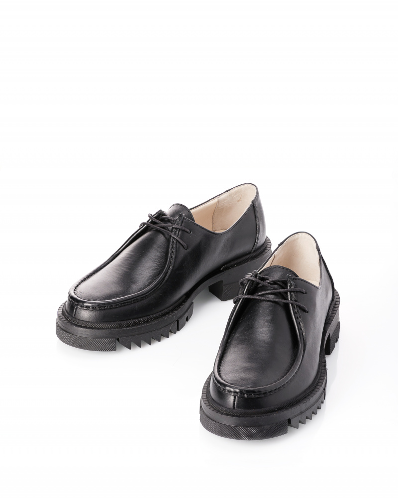 Пара из мягкой матовой чёрной кожи с закруглённым носом, подчёркнутым  объемным швом, открытой шнуровкой, позволяющей  отрегулировать посадку на ноге и комфортной анатомической  стелькой.