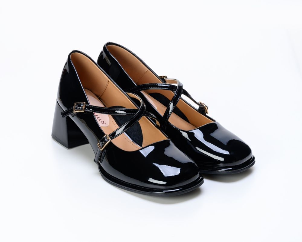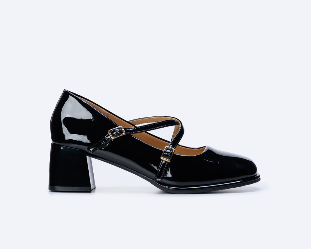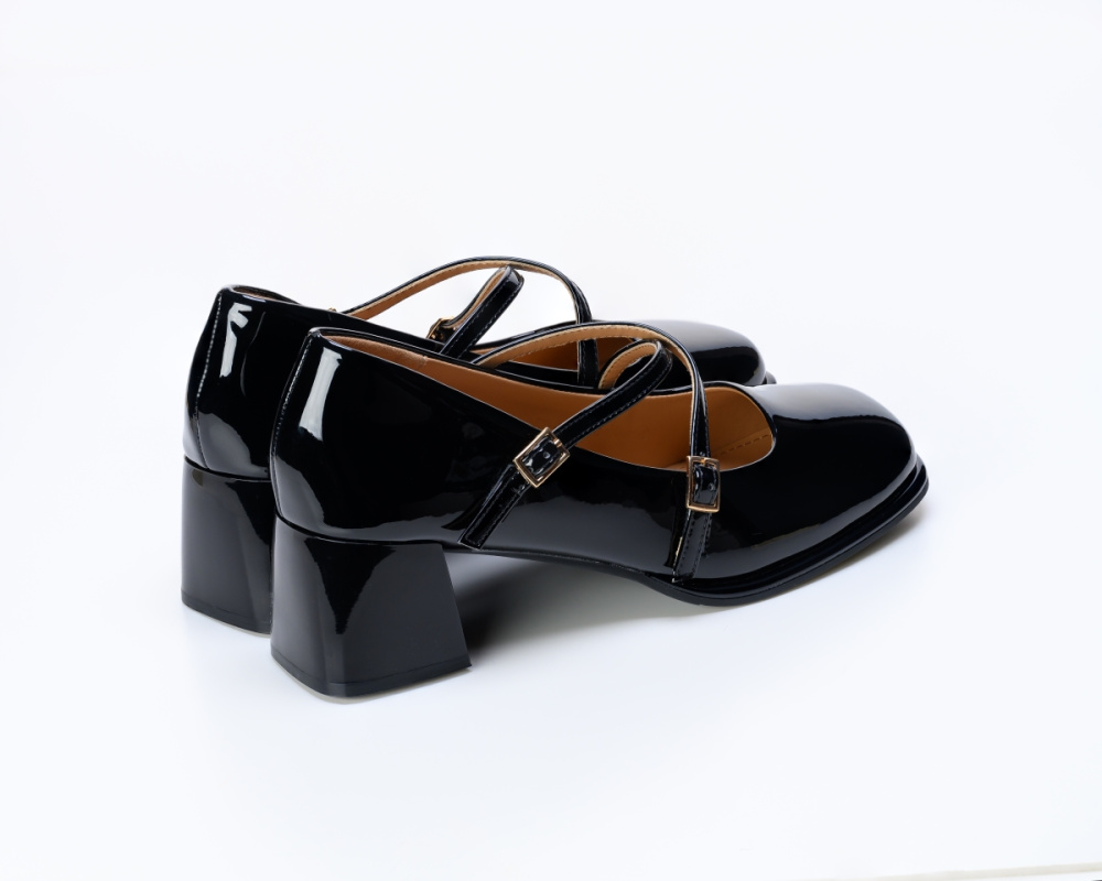 Культовый силуэт Мэри Джейн приобрел новое звучание за счет устойчивого каблука, корма которого эффектно перекликается с квадратной носочной частью, образуя геометричный дуэт. Мягкие ремешки комфортно обхватывает ногу и легко регулируется по размеру.Наличие резинки под пряжкой обеспечивает удобство надевания не растегивая. Модель выполнена из натурального  лака. Пдойдет как на стандартную полноту так и на более обьемную. Туфли можно носить, как в классическом варианте с колготками, так и актуальным способом с гольфами или длинными носками.