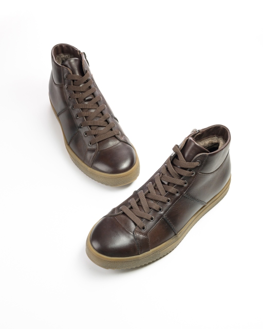 Стильные высокие мужские кеды из натуральной кожи в коричневом цвете. Модель на  подошве медового цвета из термоэластопласта (ТЭП), который представляет собой обувную подошву из синтетических полимеров, лишенную недостатков резины. Термоэластопласты обеспечивают хорошее сцепление изделия с различными поверхностями и высокую сопротивляемость деформациям, а также подходит для использования в холодное время года. Внутри - подкладка шерсть, для осени и зимы мягкая утепленная шерстяная стелька. Кеды можно сочетать не только с джинсами, но и с брюками зауженными к низу.