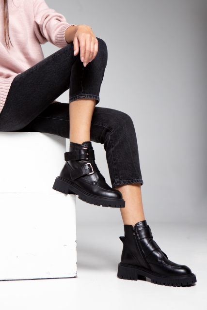 Ботинки Caterina  с  широкими  регулируемыми ремнями на  подъеме  выглядят дерзко,  модно , но при этом  не уступают в  комфортности. Модель выполнена из натуральной кожи в черном цвете. Молния с внутренней стороны ботинка  облегчает  снимать и надевать обувь не задействовав при этом пряжки ремней.  Внимание заостряет на себе  и утолщенная подошва с протектором для устойчивости  и рифленой боковой частью. Такая модель станет модной фишкой гардероба и будет хорошо сочетаться с укороченными джинсами, дерзкими мини, толстыми колготками.