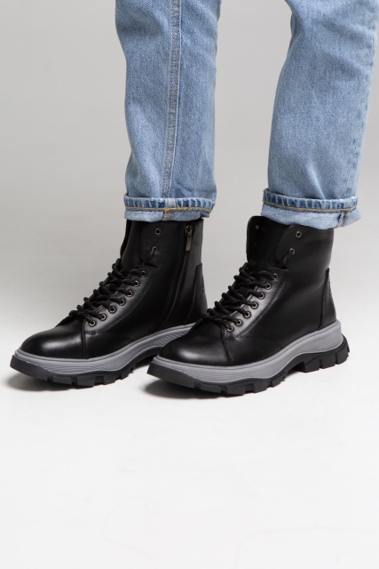 Ботинки Monica  с акцентом на сочетание цветов и фактур деталей выполнены из мягкой натуральной кожи. Утолщенная рельефная подошва в спортивном стиле из облегченного материала термоэластопласта, который  практически не скользит по мокрым и заснеженным дорогам и подходит для зимних температур,  сочетается с основными цветами модели. Ботинки шнуруются в тон модели, с внутренней сторны имеется молния, что облегчает процесс надевания и снятия, поскольку не нужно расшнуровывать, а также делает модель подходящей  для любой полноты щиколотки и голени. Модель изготавливается  на различных подкладках- байка, шерсть или мех.  Модные ботинки поддержат современный городской образ с пуховиками, пальто или бомберами, согреют Вас в холодную погоду. Модель не маломерит, подходит для широкой стопы.