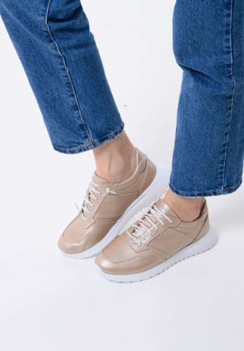 Кроссовки входят в список «must have» для тех, кто не хочет выбирать между стилем и функциональностью.  Эта эффектная  модель выполнили из  мягкой натуральной кожи золотисто бежевого оттенка . Подкладка из натуральной кожи и кожаная анатомическая стелька  отвечает за  комфортный микроклимат для ног. Лаконичная  легкая подошва  делает модель универсальной для дополнения актуальных повседневных  образов ,а так же   долгих  городских прогулок и поездок на природу.