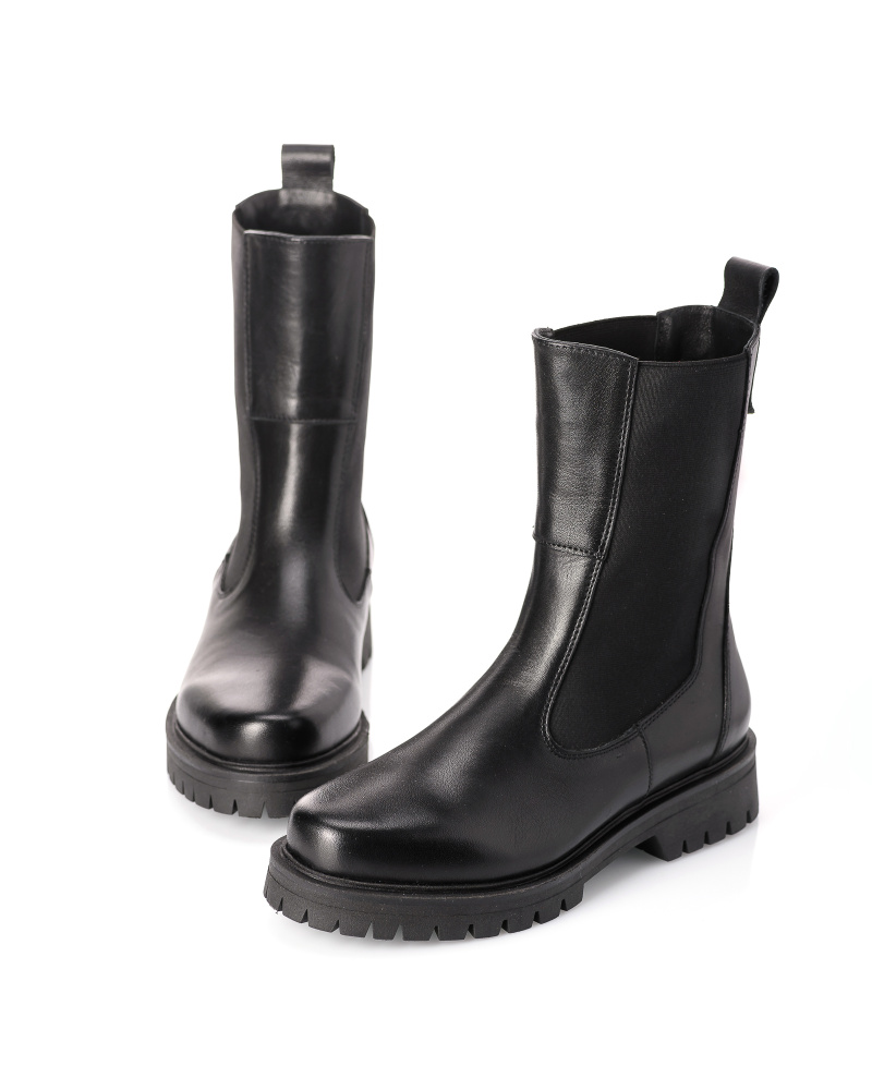Высокие Челси, в черном цвете из натуральной кожи на подошве с протектором, которая защитит от холода и грязи, будут стильным дополнением модного образа. Резинки с двух сторон обеспечивают оптимальную посадку по ноге и удобство для надевания и снятия.Челси из натуральной кожи до середины икры  с  мягкой подкладкой из байки или шерсти, комфортной стелькой, отлично впишутся в осенние и зимние образы.
